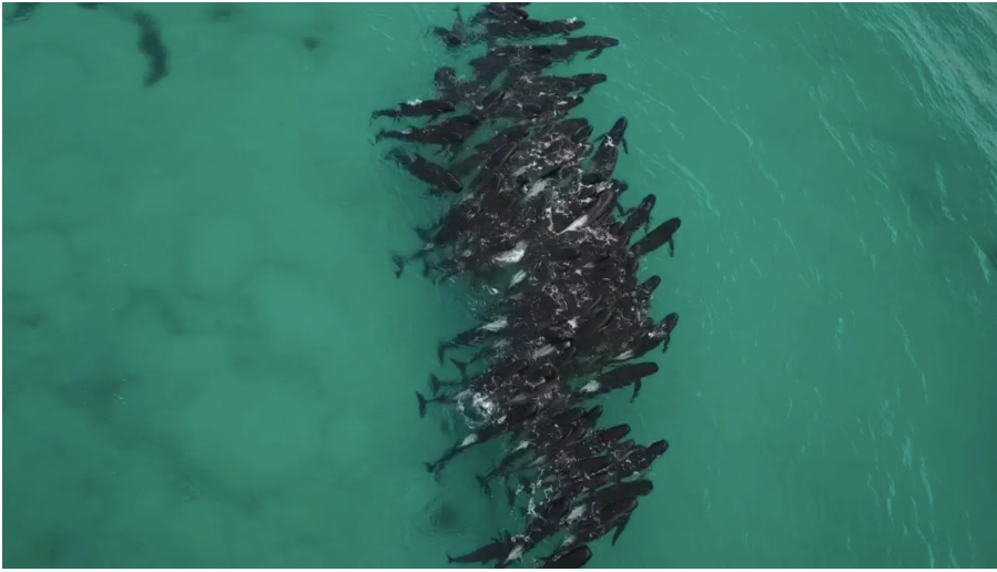 Bir başka videoda ise balinaların bir araya toplandığı ve hareketsiz kaldıkları görülüyor.