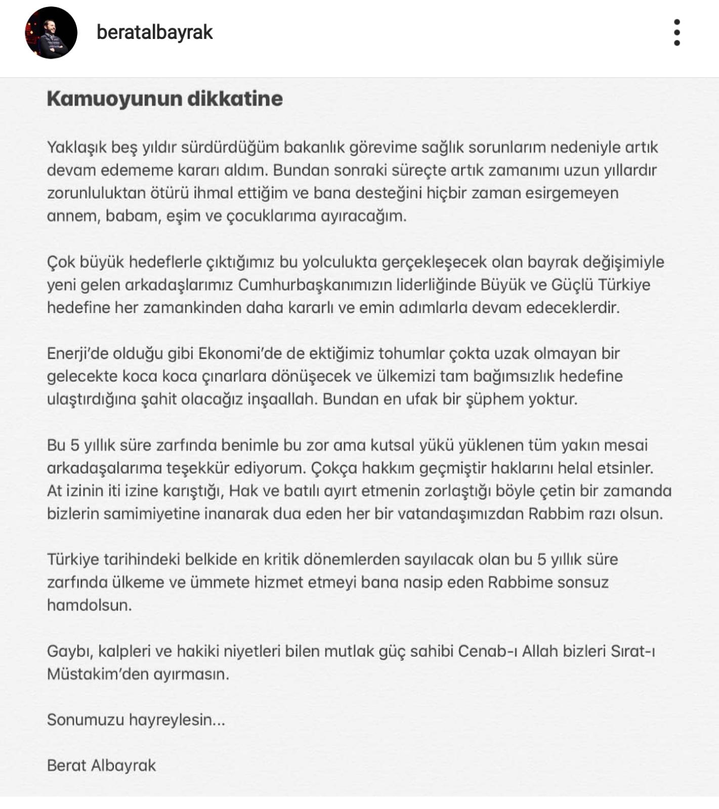 Berat Albayrak’ın resmi Instagram hesabından, sağlık sorunları yüzünden bakanlığı bıraktığı açıklaması yayınlandı.
