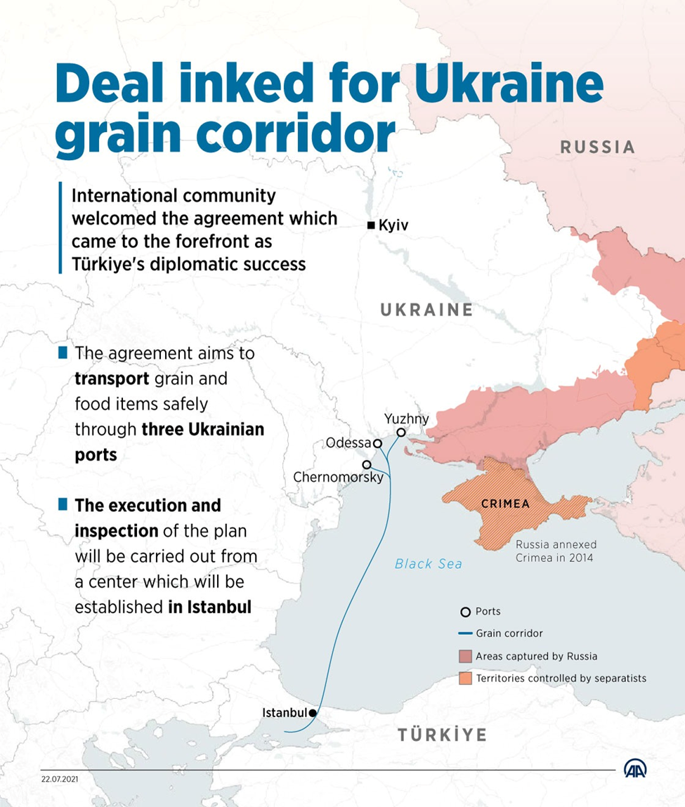 Dün (22 Temmuz), Türkiye Cumhurbaşkanı Recep Tayyip Erdoğan ve Birleşmiş Milletler Genel Sekreteri Antonio Guterres’in katılımıyla Ukrayna’da işgal nedeniyle ihracatı durdurulan tahıllar için güvenli bir geçiş koridoru sağlanması amacıyla Rusya ile Ukrayna arasında bir uzlaşı sağlandı. Hem Rusya hem Ukrayna Türkiye ve BM’nin de taraf olduğu bir mutabakat metnini ayrı ayrı imzaladı. Türkiye ve BM, Rusya ve Ukrayna ile aynı hükümleri içeren iki ayrı mutabakat metni imzalayarak, birbiriyle savaşan iki ülkenin aynı metne imza atarak birbirine hukuki meşruiyet kazandırma çekincelerini karşılamış oldu. İmzalanan mutabakat metni, güvenli bir tahıl sevkiyatını öngören bir geçiş koridoru hakkında. Türkiye’yi temsilen Savunma Bakanı Hulusi Akar’ın imzaladığı mutabakat metinlerini, Rusya adına Savunma Bakanı Sergey Şoygu, Ukrayna adına Altyapı Bakanı Oleksandr Kubrakov imzaladı.