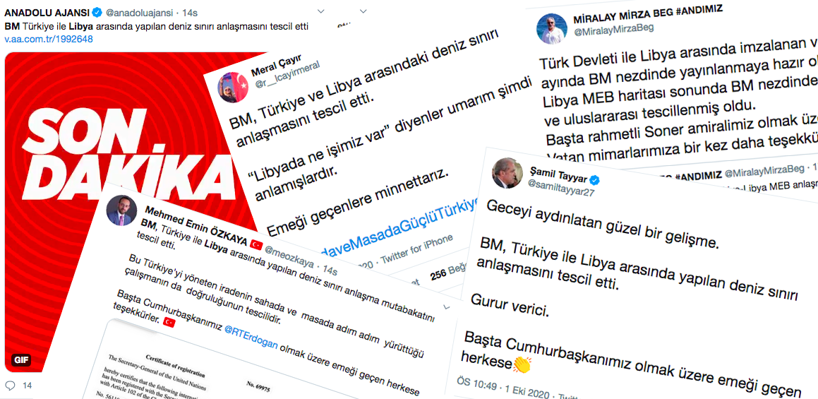 1 Ekim Perşembe günü Dışişleri Bakanı Mevlüt Çavuşoğlu, gece yarısına 10 dk kala attığı bir tweet’le Türkiye ve Libya hükümetleri arasında 27 Kasım 2019’da imzalanan “Deniz Yetki Alanlarının Sınırlandırılmasına İlişkin Mutabakat Muhtırası” anlaşmasının Birleşmiş Milletlerce tescil edildiğini duyurdu.