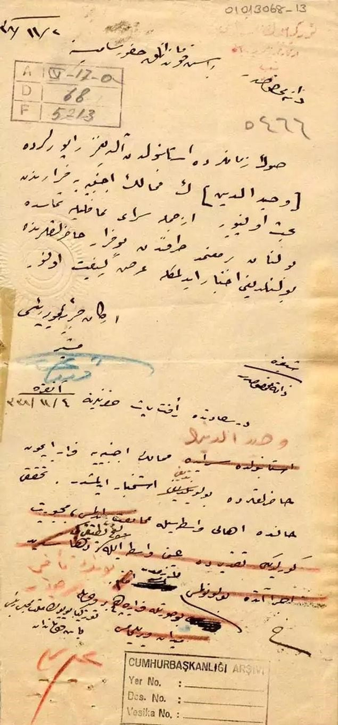 Fevzi Paşa’nın Mustafa Kemal Paşa’ya Vahideddin’in bir yabancı memlekete firar edebileceği yolundaki yazısı ve yazının alt tarafında Mustafa Kemal Paşa’nın “Bunun gerçekleşmesi hâlinde halk vasıtası ile linç” talimatı. Metnin üzerinde kırmızı kalemle yapılmış olan değişiklikler, Mustafa Kemal Paşa’nın elyazısıdır (Cumhurbaşkanlığı Arşivi, 01013068-13).