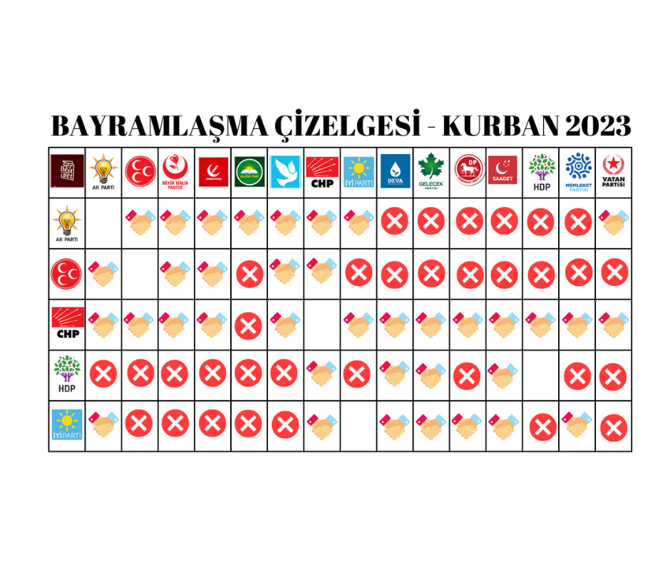 Siyasi partilerin geleneksel bayramlaşma mesaisi bayramın 2'nci günü başlayacak. MHP'nin bayramlaşma programında ittifak ortağı HÜDA-PAR yok. En yoğun bayramlaşma mesaisi CHP'de. CHP, sadece HÜDA-PAR ile bayramlaşmayacak. AK Parti, CHP ve İYİ Parti ile bayramlaşacak ama DEVA, Gelecek ve Saadet’le yine bayramlaşmayacak. HDP ile ise sadece dört parti bayramlaşacak: CHP, Saadet, Gelecek ve DEVA.