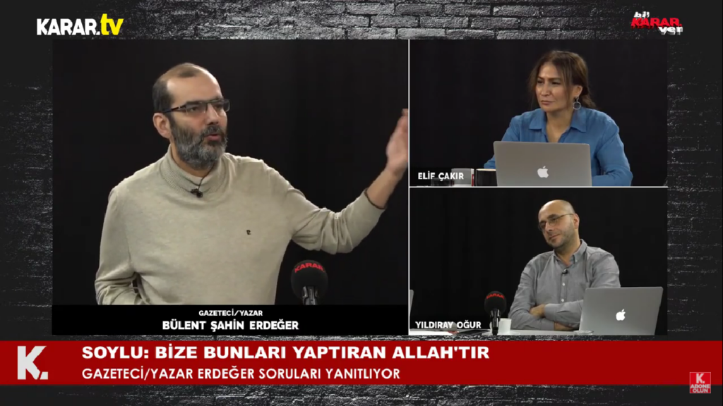 Gazeteci Bülent Şahin Erdeğer, Karar TV’de Elif Çakır ve Yıldıray Oğur’un “Bi Karar ver” programına konuk oldu. Erdeğer, İçişleri Bakanı Süleyman Soylu’nun “Yaptıklarımızı bize Allah yaptırıyor” çıkışını nasıl değerlendirdiğinin sorulması üzerine şunları söyledi: