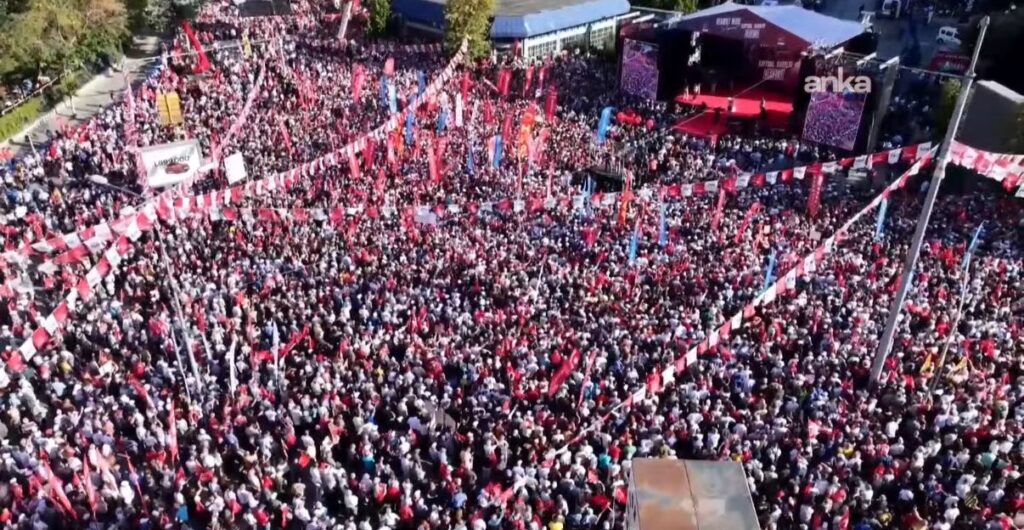 Millet bu iktidardan desteğini çekmiştir, millet kendi dertleriyle dertlenen bir iktidar umuduna bel bağlamıştır. Veresiye defterlerini kapatan, 762 tane kreş açarak yoksulun çocuğuna da erken yaşta eğitim hem de annesine istihdam olana sağlayan CHP’li belediyelere, 77 öğrenci yurdu açarak yoksulun çocuğunu cemaatlere tarikatlara değil eşit hizmet alacakları belediye yurtlarına yönlendiren CHP’li belediyelere, yoksullara süt verenlere, beslenme çantalarını dolduranlara, kırtasiye desteği verenlere ‘hoşgeldin bebek paketi’ ile yoksulun çocuğuna hoşgeldin diyenlere ve yatağındaki yaşlıya da kundaktaki çocuğa da bu milletin evlatları diye sahip çıkan belediyelere sarılmış son seçimlerde kendi değişen Türkiye’ye değişim vaat eden Cumhuriyet Halk Partisi’nde karar kılmıştır. Partimiz 47 yıl sonra Türkiye’nin birinci partisi olmuştur. AK Parti kurulduğu günden itibaren ilk kez yenilmiştir. Milletin kararına saygı duyması, hatayı kendinde araması, bizimle hizmette yarışması gerekirken en kötü yola en berbat yola tenezzül etmiştir. Millete umut vaat edemeyen iktidar, milleti korkutarak ve baskı altına alarak ayakta kalmayı tercih etmiş. Bunu denemektedir bugün. Türkiye’de demokrasi ile göreve gelen bir iktidarın demokrasi treninden inmesinin ve ülkeyi sandıkla değil baskıyla yönetme tercihinin ağır sonuçlarıyla karşı karşıyayız. Milletimiz ağır bedeller ödemektedir. İşte bu anlayış cumhurbaşkanı adayını belirleyeceğimiz 23 Mart tarihine giderken bundan dört gün önce 19 Mart tarihinde cumhurbaşkanı adayımız Ekrem İmamoğlu‘nu gözaltına almış, tam dört gün gözaltında tutmuş. 15 buçuk milyon seçmenle kendisi cumhurbaşkanı adayı gösterilirken onu demir parmaklıklar arkasına koymuştur. Buradan hep birlikte seslenmek isteriz ki bizim cumhurbaşkanı adayımız Ekrem İmamoğlu.
