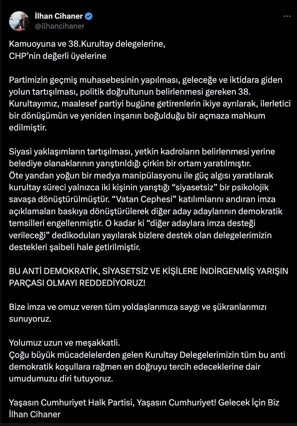 CHP’de genel başkanlığa aday olmak için kurultayda imza toplaması beklenen İlhan Cihaner, adaylıktan vazgeçti.