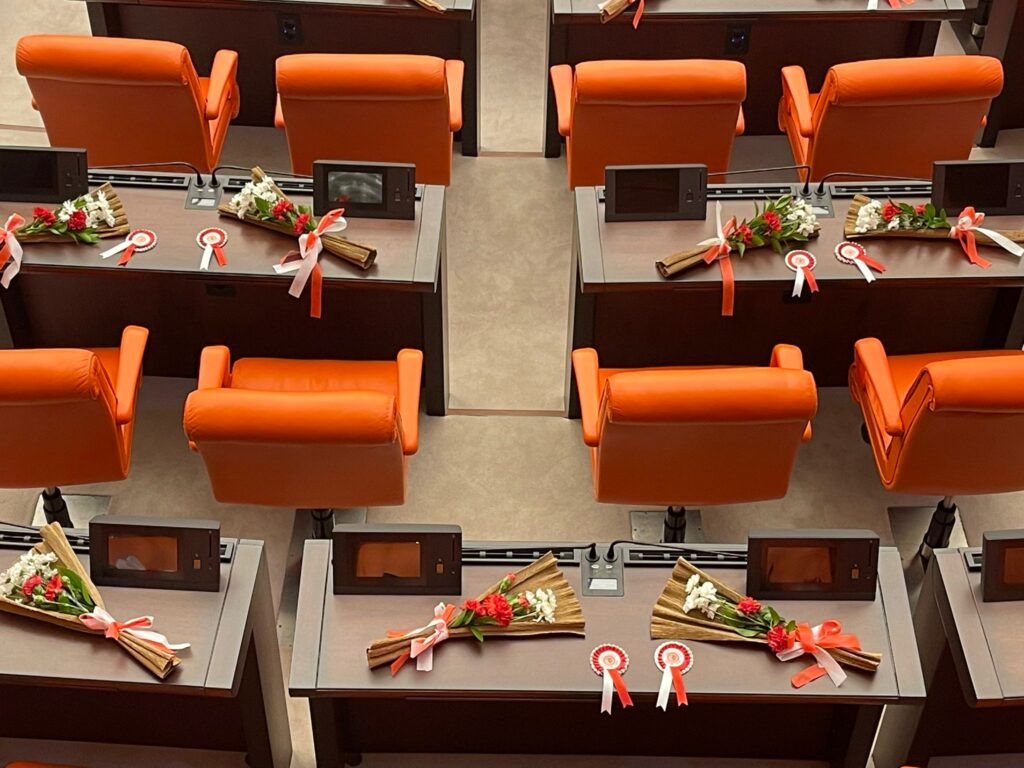 TBMM sıralarına seçilen yeni milletvekilleri için karanfiller konuldu.