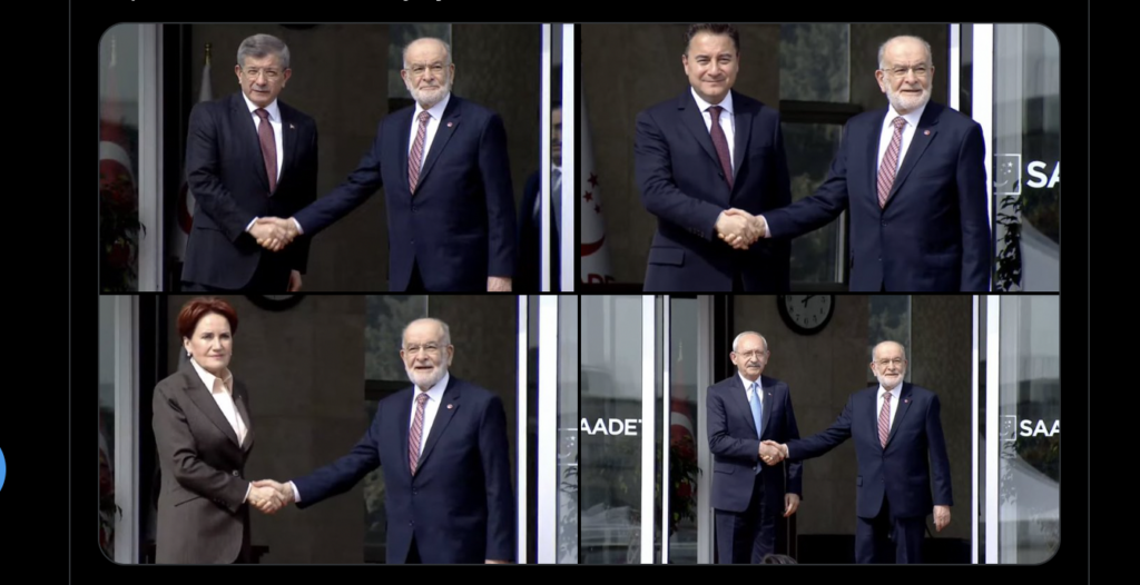13.15 – Liderler Saadet Partisi Genel Merkezi’ne geldi. Saadet Partisi Genel Başkanı Temel Karamollaoğlu tüm liderleri kapıda karşılayarak asansöre kadar eşlik etti.