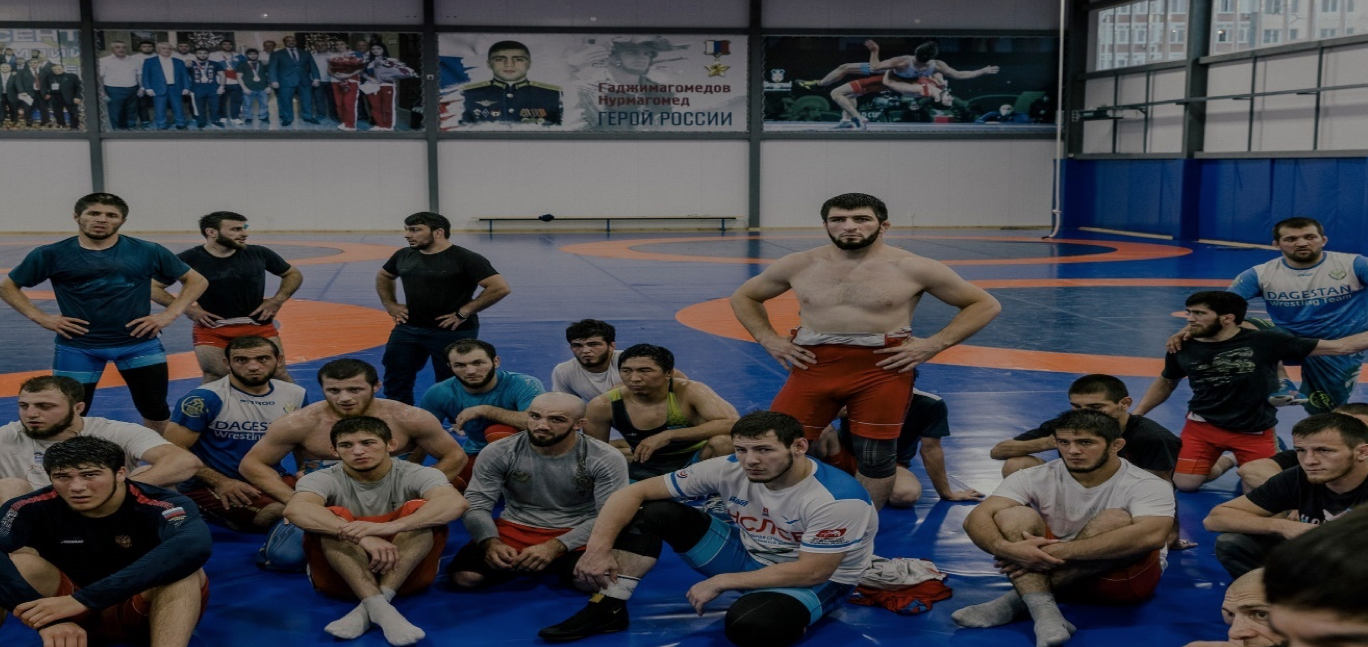 Ulusal güreş takımı: Ukrayna’da resmi olarak öldürülen ilk Rus asker Nurmagomed Gadzhimagomedov’un arka planda posteri bulunan bir eğitim oturumu.