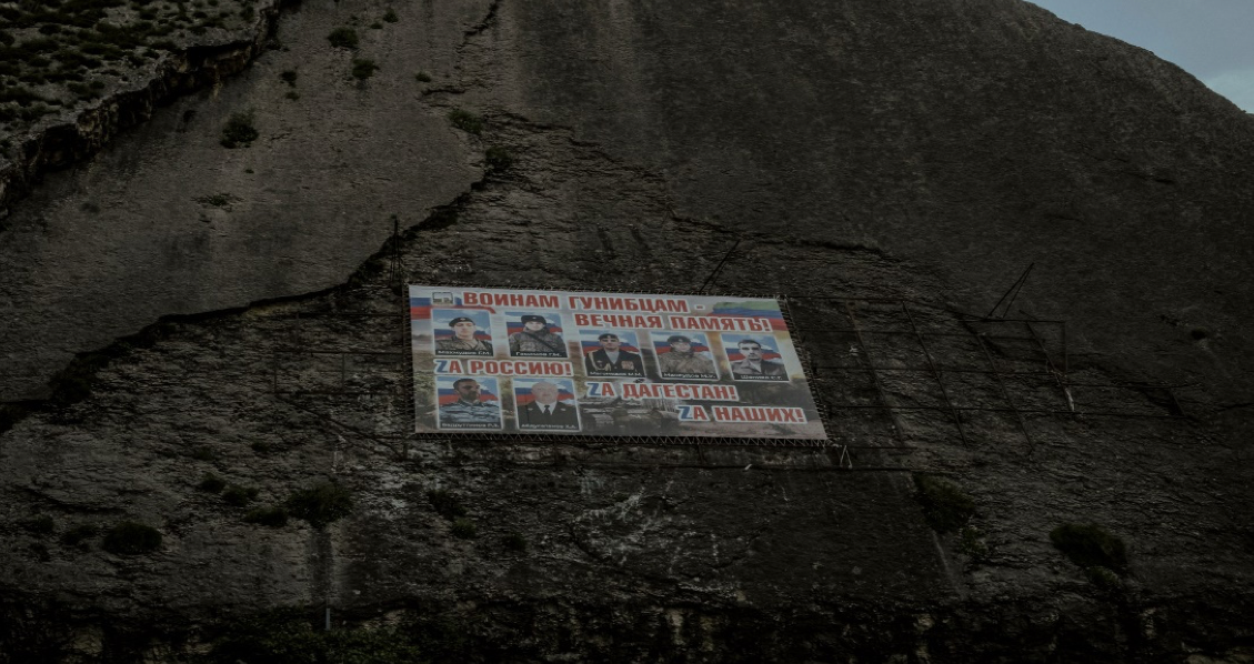 A poster honoring killed soldiers from the Gunib district in Dagestan hanging on the side of a mountain.