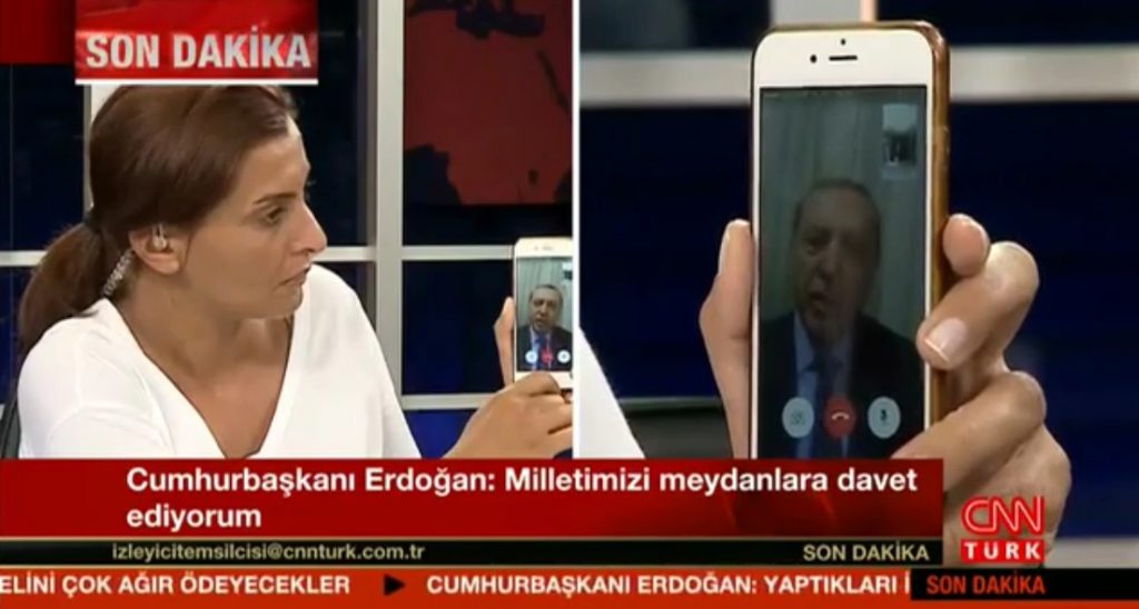 For several hours it wasn’t clear where President Erdoğan was, but other prominent AKP leaders were constantly on the air. Around 00:30, President Erdoğan finally appeared — on a live feed via cell phone on CNN Türk. Here is one thing that should be mentioned: by then all TV channels, regardless of previous political allegiences, had united in open opposition to the coup. The channel President Erdoğan first called was CNN Türk, which has been an opposition channel for many years, and is owned by Aydın Doğan, one of Turkey’s most powerful media barons. And Doğan had clashed with the AKP on a number of occasions.