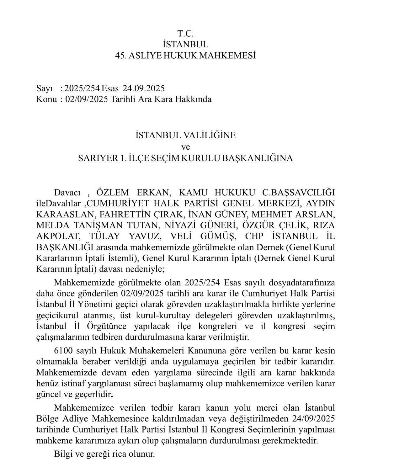 “Verilen tedbir kararı henüz istinaf yargılaması süreci başlamamış olup mahkememizce verilen karar güncel ve geçerlidir. Mahkememizce verilen tedbir kararı kanun yolu mercii olan İstanbul Bölge Adliye Mahkemesince kaldırılmadan veya değiştirilmeden 24/09/2025 tarihinde Cumhuriyet Halk Partisi İstanbul İl Kongresi Seçimlerinin yapılması mahkeme kararımıza aykırı olup çalışmaların durdurulması gerekmektedir.”