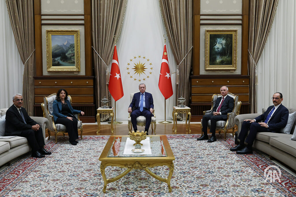 Cumhurbaşkanı Recep Tayyip Erdoğan, DEM Parti İmralı Heyeti üyeleri TBMM Başkanvekili Pervin Buldan ile milletvekili Mithat Sancar’la Beştepe’deki Cumhurbaşkanlığı’nda 1 saat görüştü.