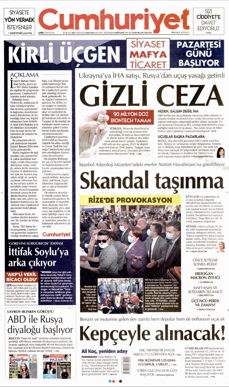 “İçişleri Bakanı Süleyman Soylu, geçen gece TRT Haber kanalında yapılan bir programda gazetemiz Cumhuriyet’i yeniden hedef almıştır. Bilindiği üzere, Türkiye’de, aralarında iktidar ortakları tarafından da kimi açıklamalarla doğrudan desteklenen mafya liderlerinin de bulunduğu kimi suç örgütü elebaşıları; hem birbirleri, hem kirli ilişkiler içinde oldukları siyasetçiler, hem de kimi devlet bürokratları ile çatışma halindedirler. Bu çatışmada adı en çok anılanların başında İçişleri Bakanı Süleyman Soylu gelmektedir. Mafya örgütleri ile bağlantıları olan gazetecilerle yakın dostluklar kurduğu, yeraltı dünyasının liderlerine sözler verdiği, onlara devlet memuru koruma ve dinlenmemeleri için ses bozucu araç tahsis ettiği vb. savlarla suçlanan Süleyman Soylu, bu savlara açıklık ve içtenlikle yanıt vermek yerine, siyasi konumunu korumak amacıyla kendisini eleştiren muhalefetin yanı sıra, görevi gelişmeleri kamuoyuna duyurmak olan Cumhuriyet gazetesini hedef almaktadır.