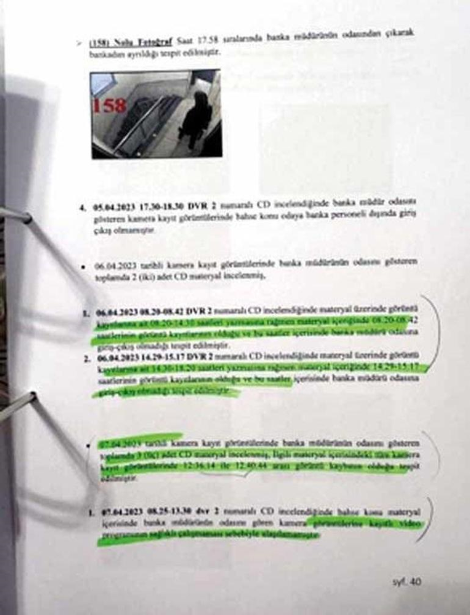 4) 07.04.2023 tarihli kamera kaydı görüntülerinde banka müdürünün odasını gösteren toplam 3 adet Cd materyal incelenmiş, ilgili materyal içerisindeki tüm kamera kayıt görüntülerinde 12.36-14 ile 12.40-44 arası görüntü kaybının olduğu tespit edilmiştir.
