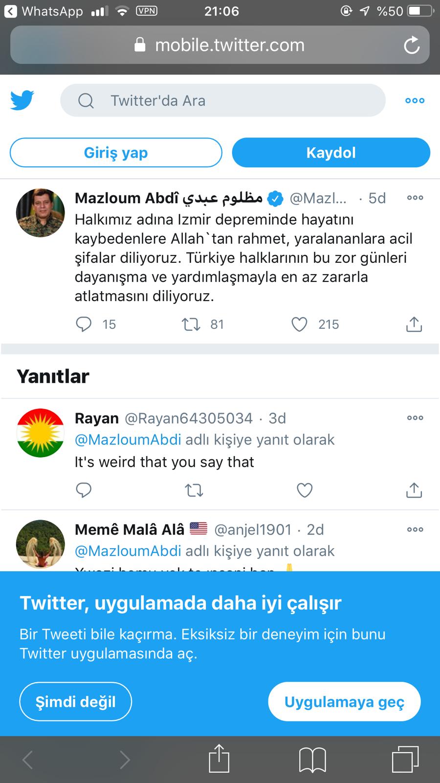 En dikkat çekici mesajlardan biri ise terör listesinde olduğu için Türkiye’de Twitter hesabı askıya alınmış olan Suriye’deki SDG/YPG güçlerinin komutanı Mazlum Abdi’den geldi.