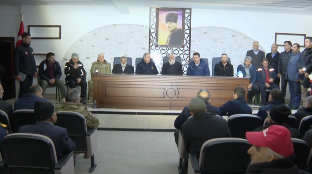 Ancak fotoğraftaki kişilerin kim olduğu çok geçmeden ortaya çıktı. Milli Savunma Bakanlığı’nın YouTube kanalında paylaşılan videodaki açıklamaya göre Hulusi Akar, Hatay Valisi Rahmi Doğan, Çevre, Şehircilik ve İklim Değişikliği Bakanı Murat Kurum ile beraberindeki heyet, Samandağ’da kanaat önderleri ile buluşup taziyelerini iletiyor.