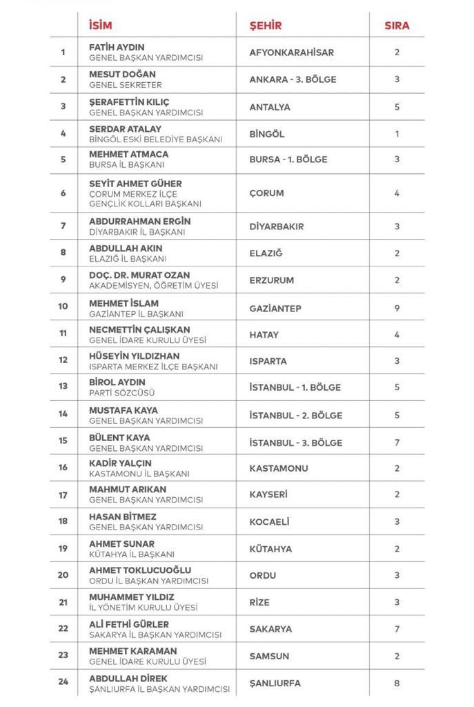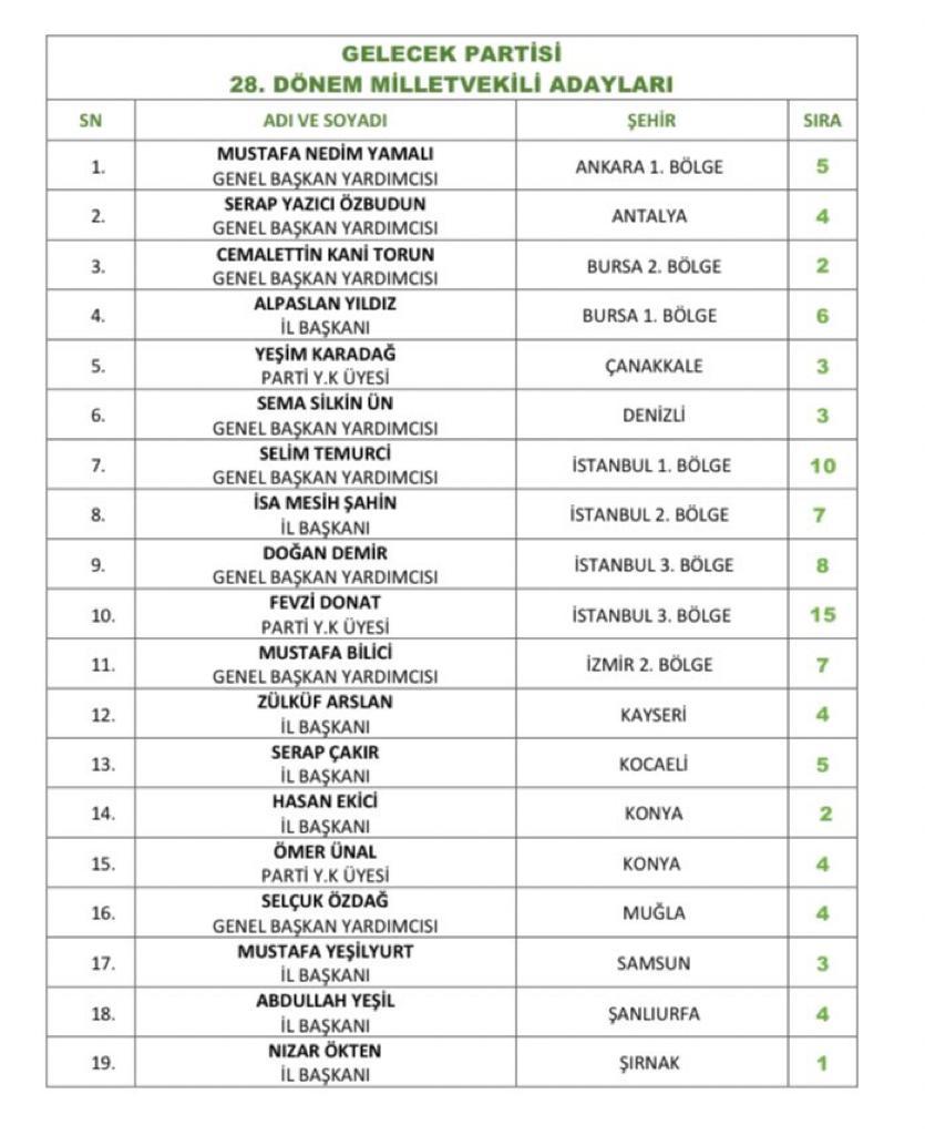 Gelecek Partisi’nden milletvekili adayı olan isimler şöyle: