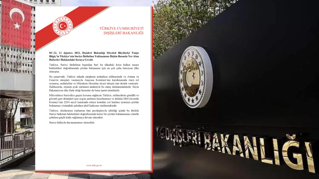 Dışişleri Bakanı Mevlüt Çavuşoğlu’nun Türkiye’nin Suriye politikasında keskin bir dönüşe işaret eden “Muhalefetle Suriye’deki rejimi bizim bir şekilde anlaştırmamız lazım. Aksi halde kalıcı barış olmaz” sözlerinin yankıları hem bölgede hem de Türkiye’de sürerken Dışişleri Bakanlığı yeni bir açıklamayla Çavuşoğlu’nun sözlerine açıklık getirdi.