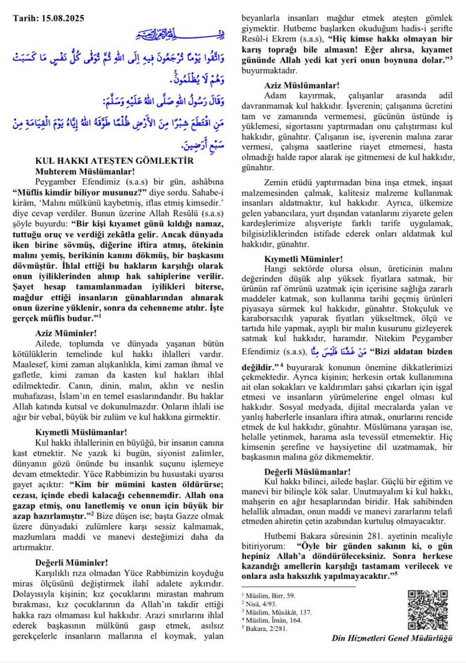 “Değerli Müminler! Karşılıklı rıza olmadan Yüce Rabbimizin koyduğu miras ölçüsünü değiştirmek ilahî adalete aykırıdır. Dolayısıyla kişinin; kız çocuklarını mirastan mahrum bırakması, kız çocuklarının da Allah’ın takdir ettiği hakka razı olmaması kul hakkıdır…”