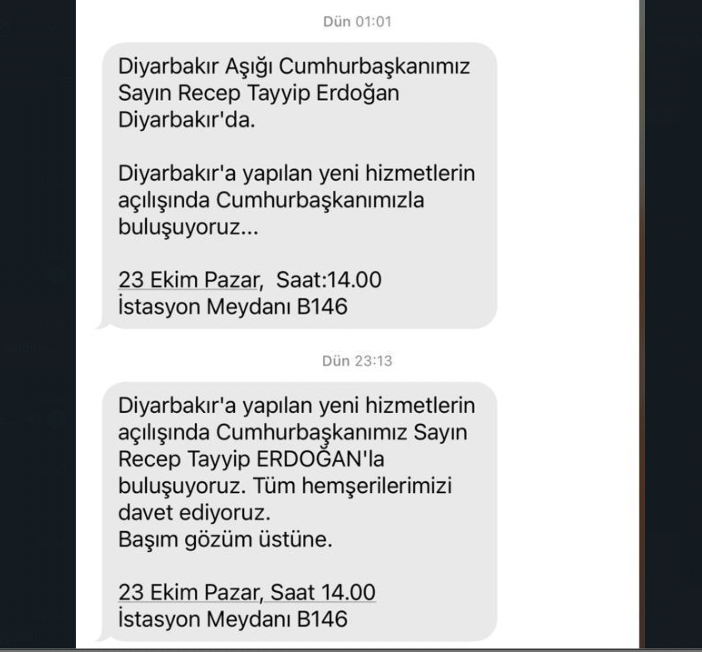 Pazar günü Diyarbakır’a gidecek Erdoğan için Diyarbakır Valiliği, bütün Diyarbakırlıların cep telefonlarına SMSler gönderdi. Gece 01.00’de yüzbinlerce Diyarbakırlının telefonuna gönderilen mesajda, "Diyarbakır aşığı Cumhurbaşkanımız Diyarbakır’da" denildi.