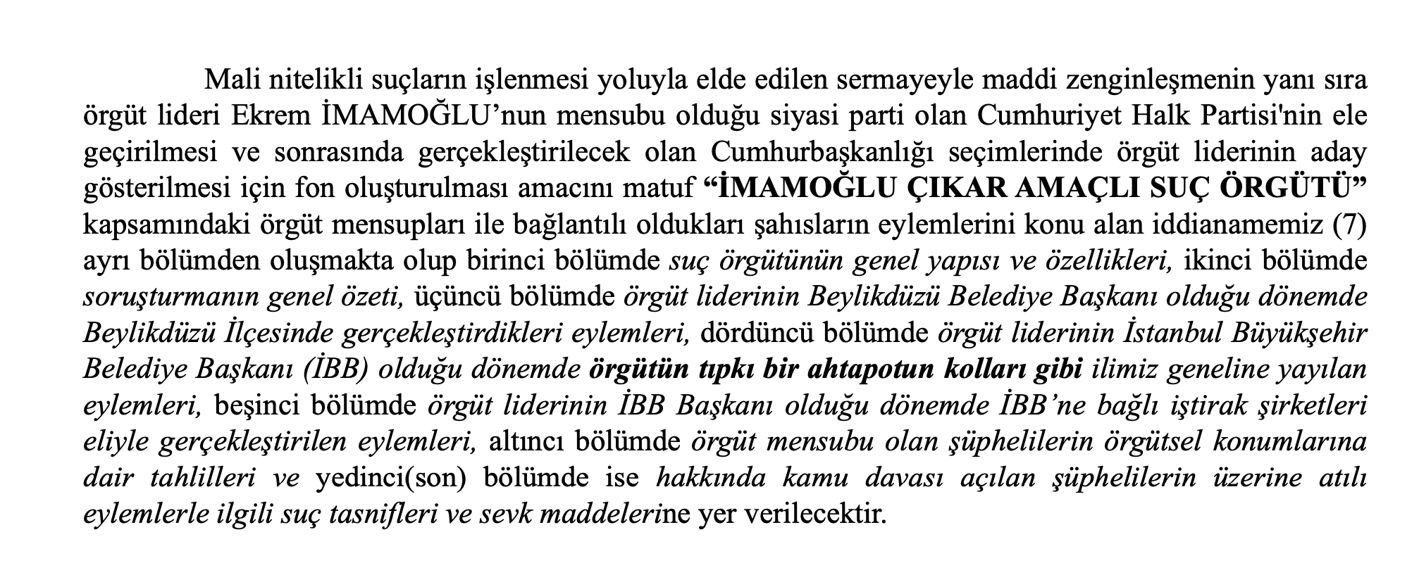 “Mali nitelikli suçların işlenmesi yoluyla elde edilen sermayeyle maddi zenginleşmenin yanı sıra örgüt lideri Ekrem İmamoğlu’nun mensubu olduğu siyasi parti olan Cumhuriyet Halk Partisi’nin ele geçirilmesi ve sonrasında gerçekleştirilecek olan Cumhurbaşkanlığı seçimlerinde örgüt liderinin aday gösterilmesi için fon oluşturulması amacını matuf “İMAMOĞLU ÇIKAR AMAÇLI SUÇ ÖRGÜTÜ” kapsamındaki örgüt mensupları ile bağlantılı oldukları şahısların eylemlerini konu alan iddianamemiz (7) ayrı bölümden oluşmakta olup birinci bölümde suç örgütünün genel yapısı ve özellikleri, ikinci bölümde soruşturmanın genel özeti, üçüncü bölümde örgüt liderinin Beylikdüzü Belediye Başkanı olduğu dönemde Beylikdüzü İlçesinde gerçekleştirdikleri eylemleri, dördüncü bölümde örgüt liderinin İstanbul Büyükşehir Belediye Başkanı (İBB) olduğu dönemde örgütün tıpkı bir ahtapotun kolları gibi ilimiz geneline yayılan eylemleri, beşinci bölümde örgüt liderinin İBB Başkanı olduğu dönemde İBB’ne bağlı iştirak şirketleri eliyle gerçekleştirilen eylemleri, altıncı bölümde örgüt mensubu olan şüphelilerin örgütsel konumlarına dair tahlilleri ve yedinci(son) bölümde ise hakkında kamu davası açılan şüphelilerin üzerine atılı eylemlerle ilgili suç tasnifleri ve sevk maddelerine yer verilecektir.”
