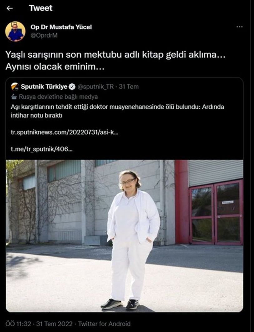 Kendisini “operatör doktor” olarak tanıtan Mustafa Yücel, doktor olmadığı iddiaları üzerine “Resmi olarak doktor olsaydım bakanlık ihraç ederdi beni. Kanunlarınız esir edilmiş hekimlerimiz için geçerli. Şahsıma hiçbir yaptırımınız yok” mesajını paylaşmıştı.