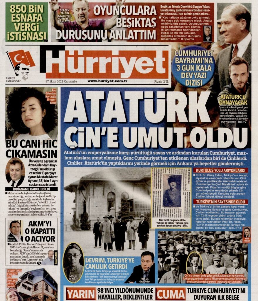 Dün tam sayfa Çin ilanı alan Hürriyet bugün de “Atatürk Çin’e umut oldu” manşetiyle çıktı. 29 Ekim Cumhuriyet Bayramı için 3 günlük bir yazı dizisine başlayan Hürriyet, Cumhuriyet’in ilanıyla ilgili dizinin ilk bölümünde; Türkiye Cumhuriyeti’nin ilk yıllarında dönemin Çin Cumhuriyeti’yle olan ilişkilerini işledi.