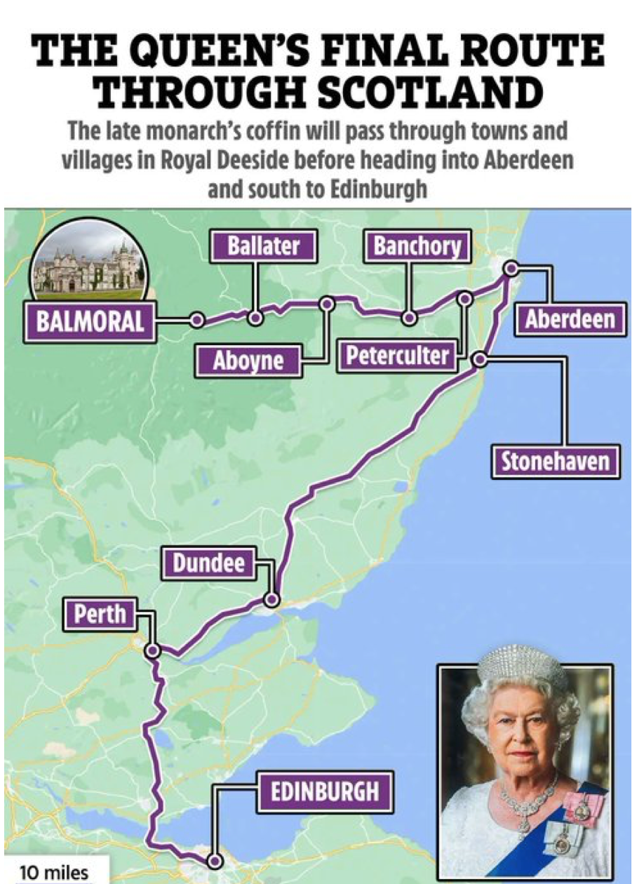 Edinburgh’a varıldığında Kraliçe’nin tabutu, kraliyet ailesinin resmi ikametgahlarından biri olan Hollyroodhouse Sarayı’nda Salı gününe kadar katafalka konacak.