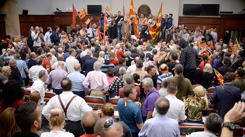Meclis binası önünde toplanan Makedon milliyetçisi İç Makedon Devrimci Örgütü-Makedonya'nın Ulusal Birliği Demokratik Partisi (VMRO-DPMNE) yanlılarının protestosu gece boyunca sürdü. Civarda sık sık ses bombaları atılırken protestocu grup da belirli aralıklarla "Makedonya" sloganları atıp Makedonya milli marşı okudu.