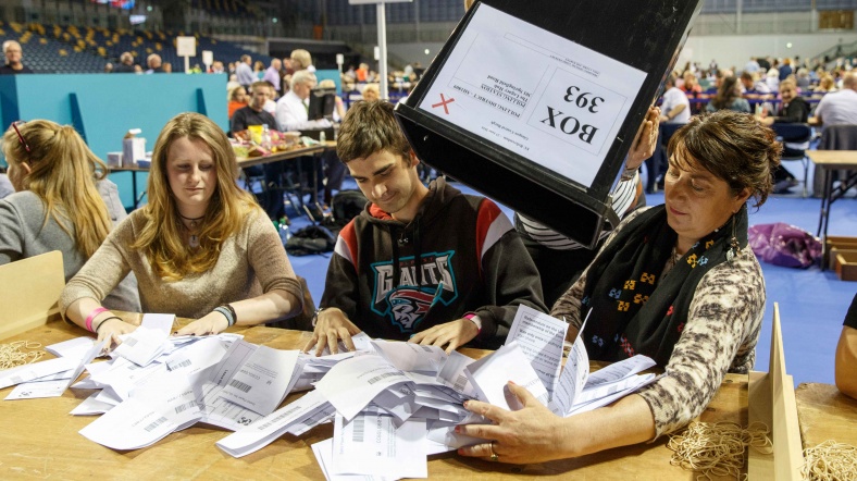Birleşik Krallık genelinde belirlenen 382 bölgede başlayan sayım işleminin ardından referandumun resmi sonucu Manchester kentindeki belediye binasında açıklanacak.