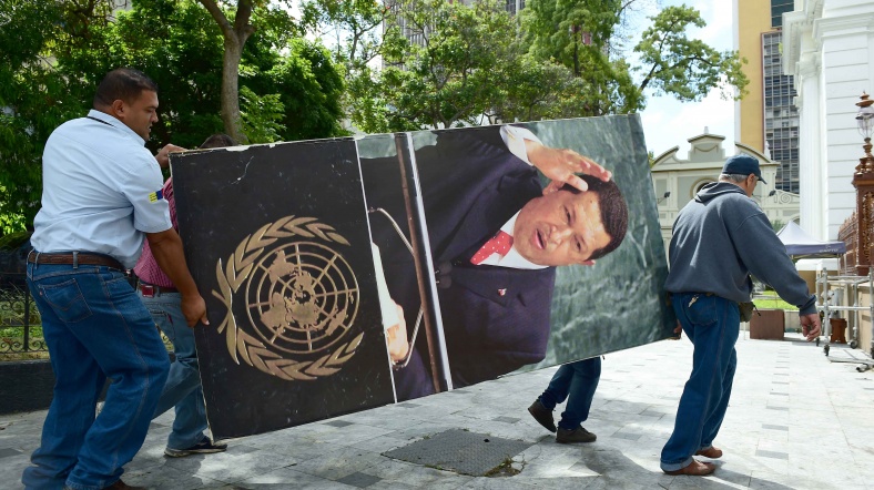 Muhalefetin 17 yıl sonra parlamentoda çoğunluğu kazanmasının ardından parlamento kurumlarından Chavez'in dev portre fotoğrafları kaldırıldı.