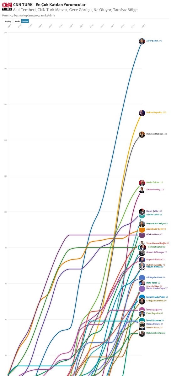 Erkek yorumcularda Takvim Gazetesi Ankara Temsilcisi Zafer Sahin açık ara önde. Üç yılda 195 kez CNNTürk ekranlarında görünmüş.