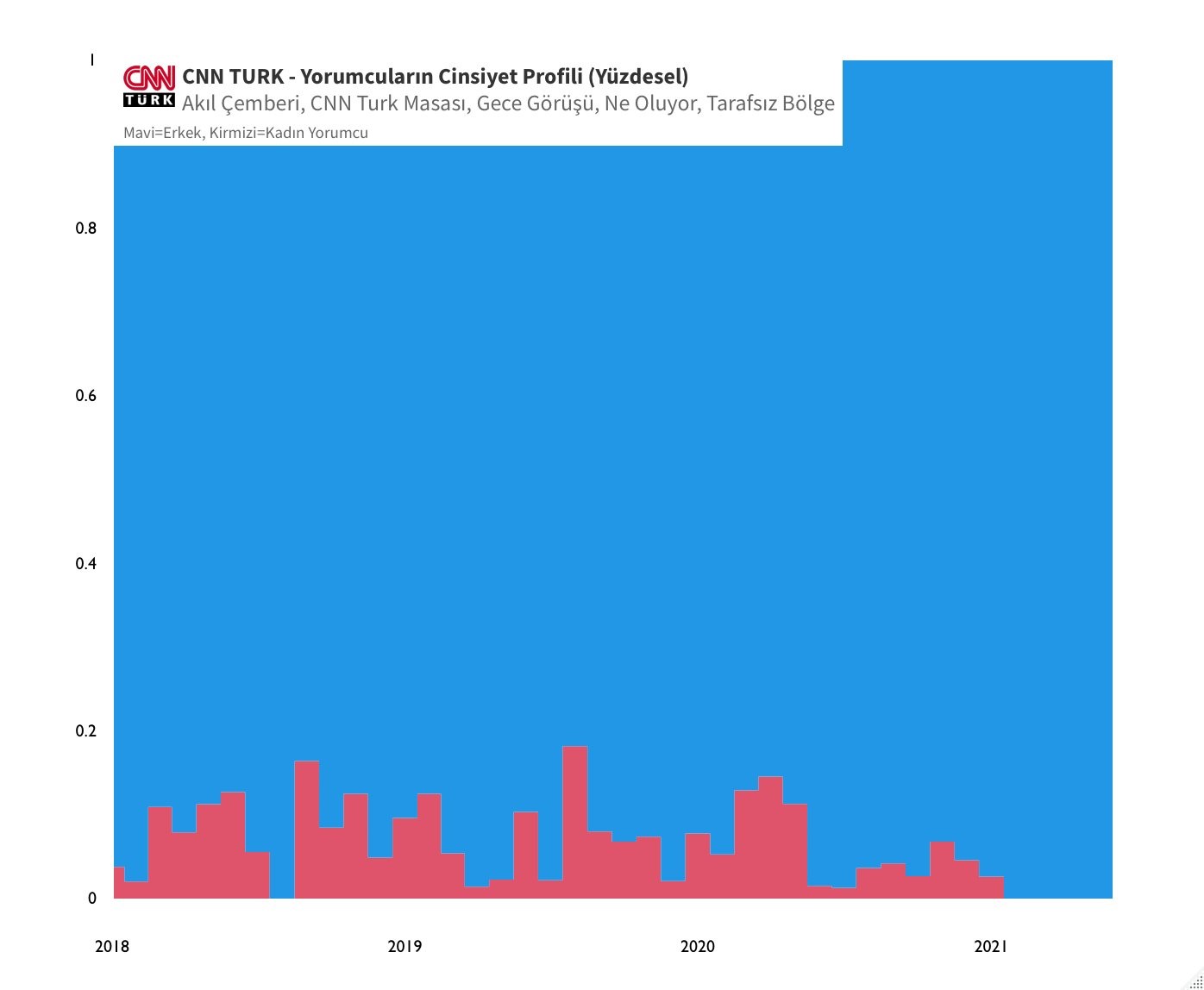 Kadınların oransal olarak en çok katıldığı tartışma programı, tek erkek moderator olan Ahmet Hakan’ın sunduğu Tarafsız bölge (%7,6). Kadın yorumcu oranı en düşük program ise Hande Fırat’in sunduğu Gece Görüşü; katılımcıların sadece %1,9’u kadın.