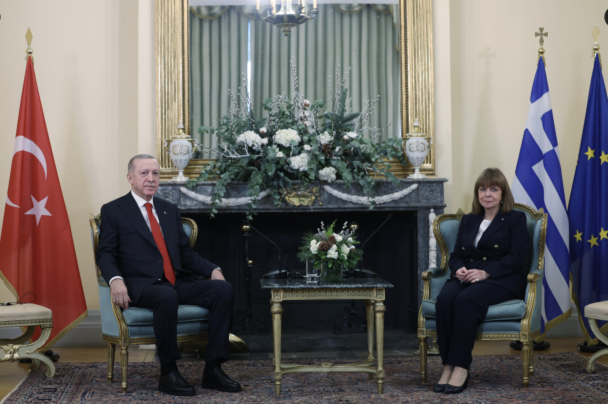 Cumhurbaşkanı Erdoğan, Atina’da ilk olarak Yunanistan Cumhurbaşkanı Katerina Sakelaropulu ile bir araya geldi.