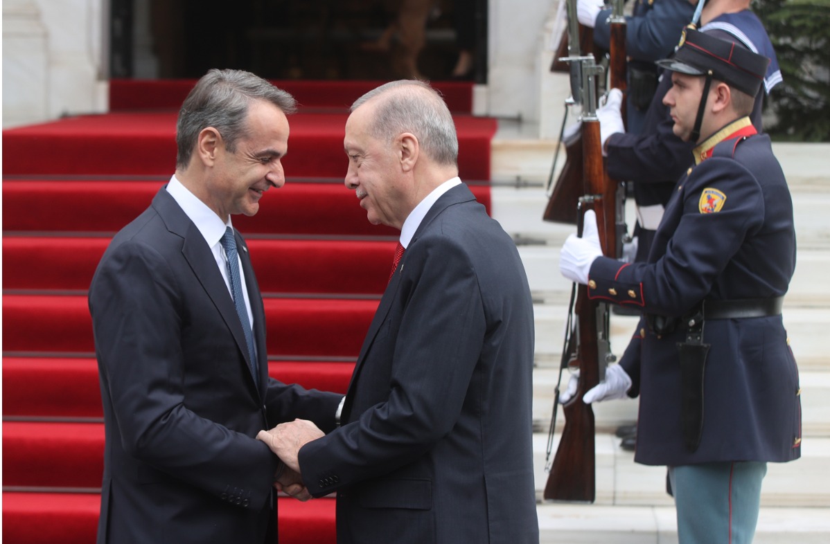Cumhurbaşkanı Erdoğan, Yunanistan Cumhurbaşkanı Katerina Sakelaropulu’ya yaptığı nezaket ziyaretinin ardından Başbakanlık ofisinin bulunduğu “Megaro Maximou” binasında Yunan Başbakan Kiryakos Miçotakis tarafından kapıda karşılandı.