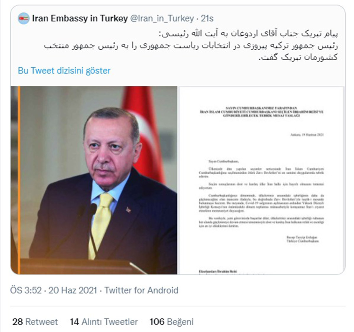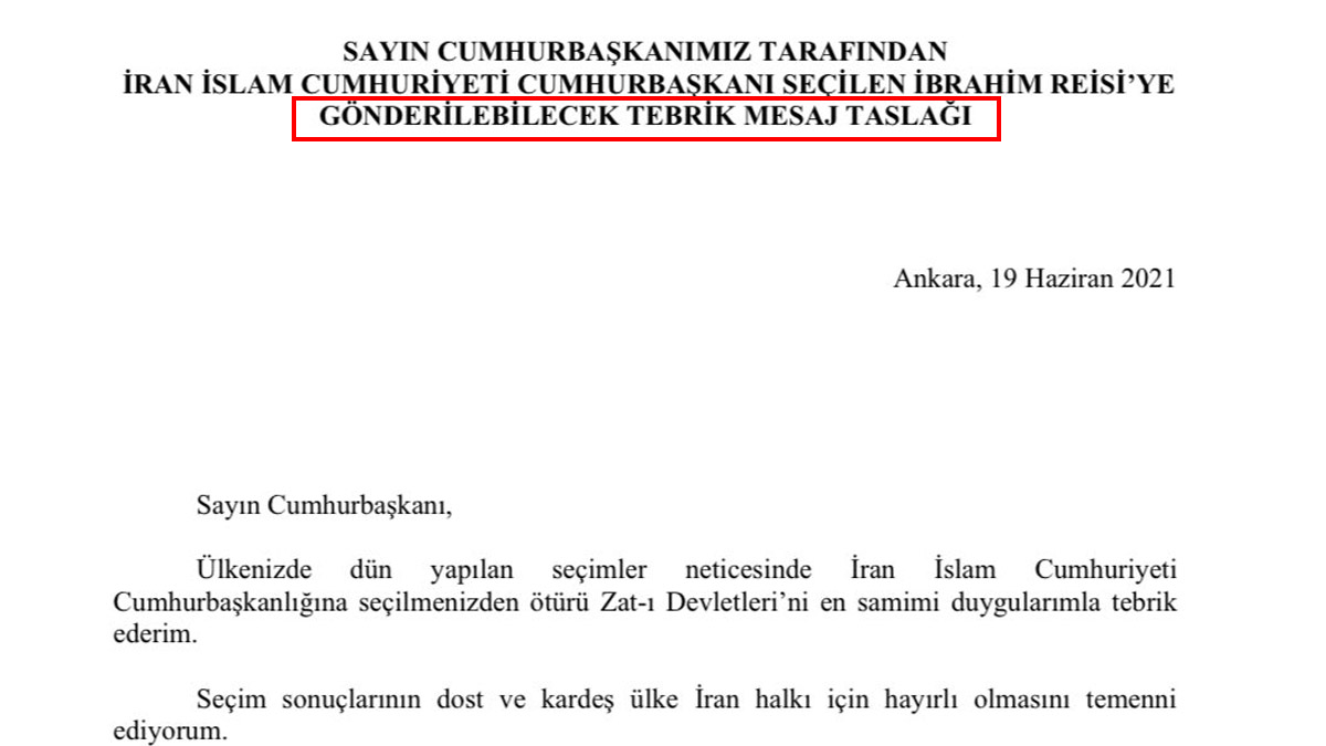 Erdoğan’ın tebrik mesajı İran Ankara Büyükelçiliği Resmi Twitter hesabından da paylaşıldı. “Türkiye Cumhurbaşkanı, cumhurbaşkanlığı seçimlerinde elde ettiği zaferden dolayı ülkemizin seçilmiş cumhurbaşkanını tebrik etti.” ifadeleri ile paylaşılan mesajda, Erdoğan’ın fotoğrafı ile gönderilen tebrik mesajının görseline de yer verildi. Ancak, paylaşımda İran’ın yeni Cumhurbaşkanı’na ‘gönderilebilecek tebrik mesajının taslağı’ başlıklı bir tebrik mesajı gönderildiği fark edildi.