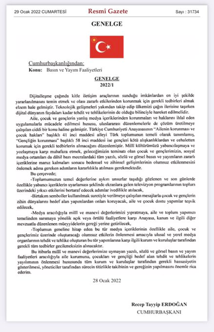 Cumhurbaşkanı Recep Tayyip Erdoğan imzasıyla, Resmî Gazete’de ‘Basın ve Yayım Faaliyetleri ile İlgili 2022/1 Sayılı Cumhurbaşkanlığı Genelgesi’ yayımlandı.