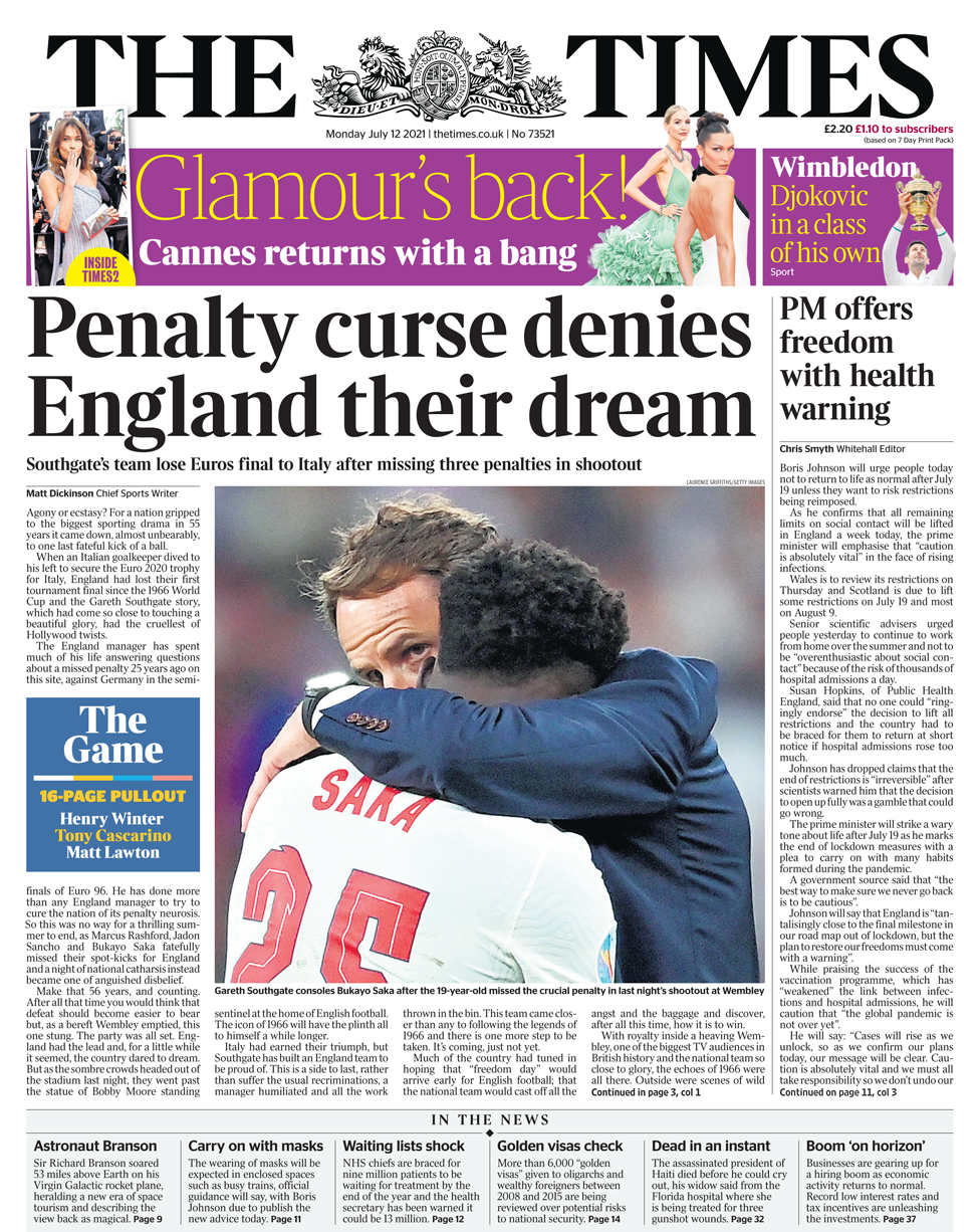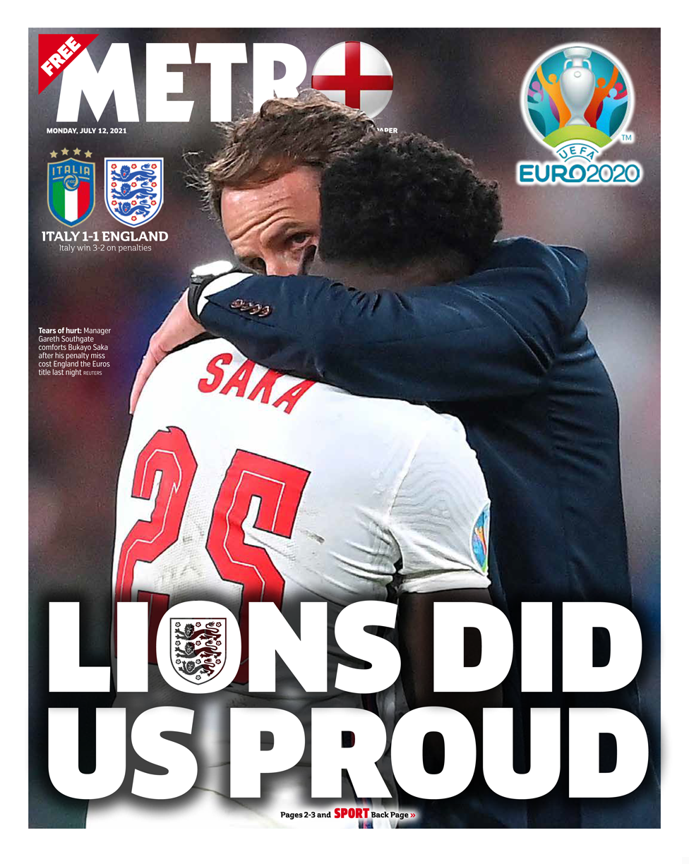 İngiliz gazetelerinin çoğunun ön sayfasında, Teknik Direktör Gareth Southgate’in penaltı kaçıran Bukayo Saka’yı sarılarak teselli ederken çekilmiş fotoğrafı yer alıyor.