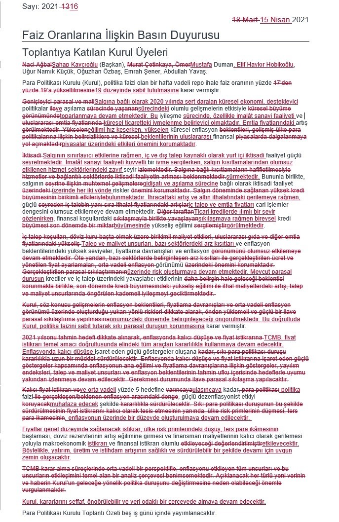 Merkez Bankası’nın Mart ayında gerçekleştirdiği Para Politikası Kurulu toplantısı ile Nisan ayı toplantısının karar metinleri arasında yapılan karşılaştırma önümüzdeki dönemde faizlerin düşürülmesi ve enflasyonla mücadelede geri adım mesajı olarak yorumlandı.