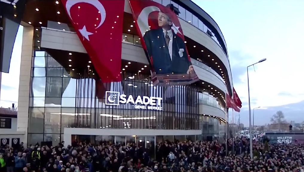 FOTO HABER | Altılı Masa zirvesinin devam ettiği Saadet Partisi Genel Merkezi’ne büyük Atatürk posteri ve bayrak asıldı