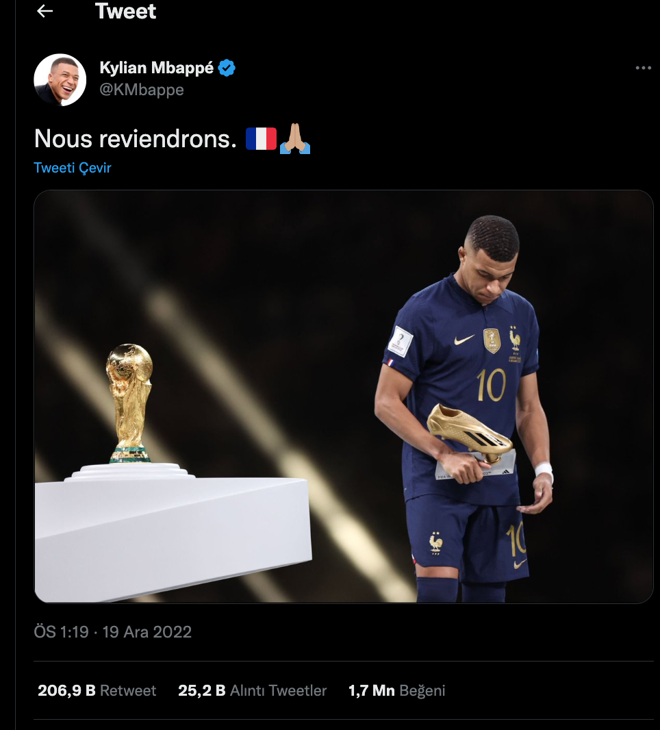 HaberlerManşetSpor FOTO HABER | Mbappe, ‘Geri döneceğiz’ yazdı, 1.3 milyon kişi beğendi Serbestiyet - 19 Aralık 2022 - 22:15 FOTO HABER | Dünya Kupası finalinde 3 gol atarak tarihe geçmesine rağmen Fransa'nın Arjantin'e kupayı kaptırmasına engel olamayan Mbappe'nin Twitter'dan yaptığı ''Geri döneceğiz' 'paylaşımı 1.3 Milyon beğeni aldı. pic.twitter.com/FZZP69XQFb— serbestiyet (@serbestiyetweb) December 19, 2022