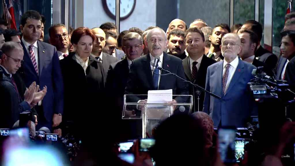20:54 – Altılı Masa zirvesi sonrası liderler beraber kürsüye çıktı. Ev sahibi Temel Karamollaoğlu, Millet İttifakı’nın ortak Cumhurbaşkanı adayının Kemal Kılıçdaroğlu olduğunu duyurdu.