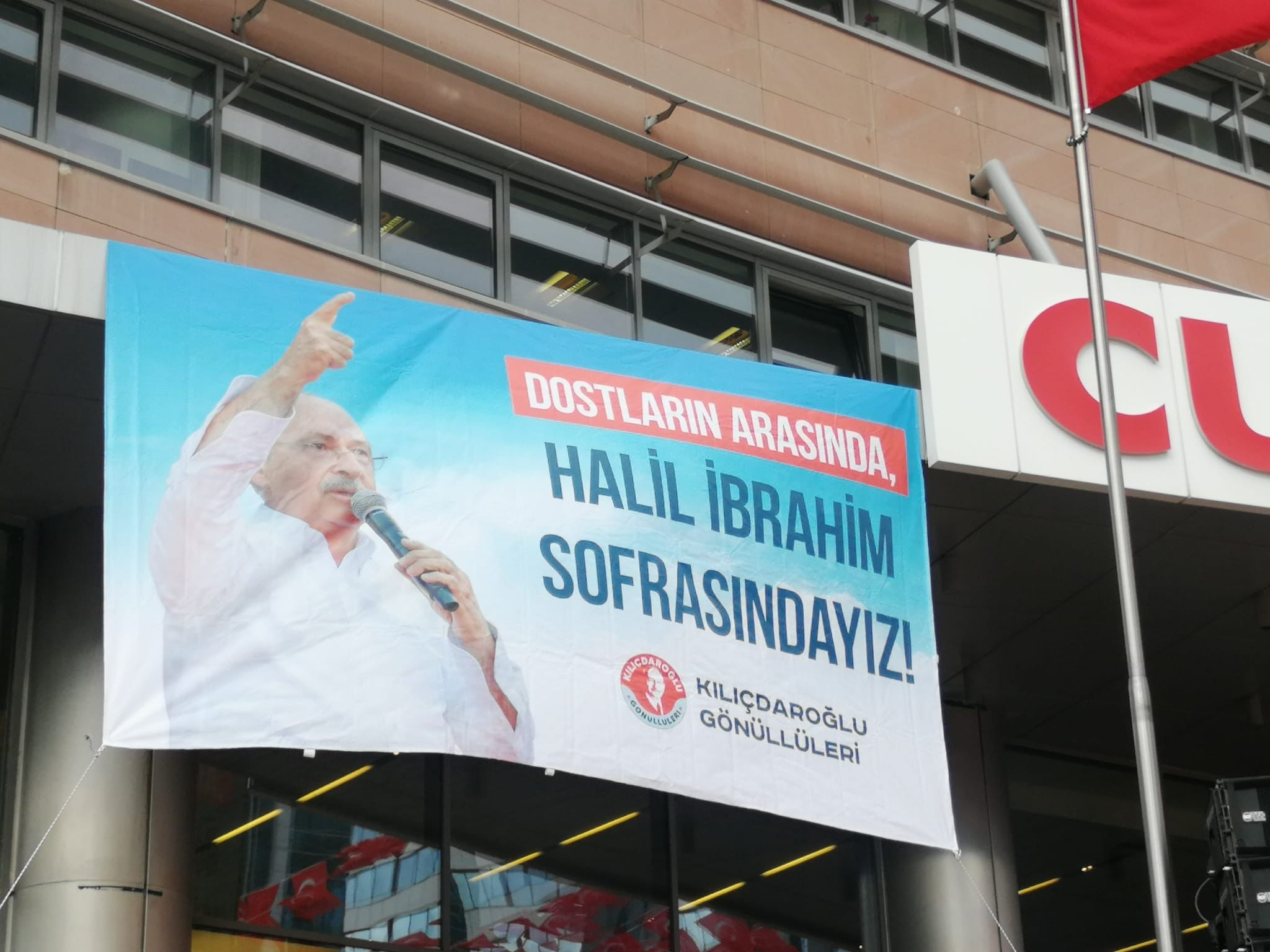 18:30 – CHP Genel Merkezi’ne “Kılıçdaroğlu Gönüllüleri” imzalı, üzerinde Kılıçdaroğlu’nun fotoğrafı olan, “Dostların arasında, Halil İbrahim sofrasındayız” pankartı asıldı.
