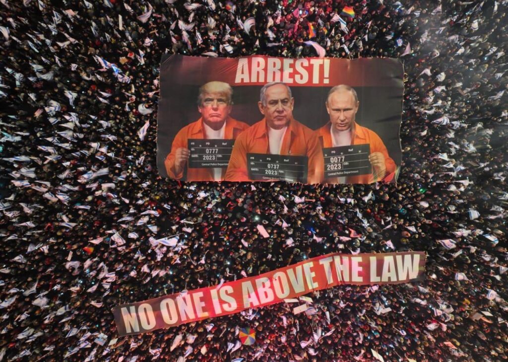 İsrail’de Netanyahu karşıtı gösteriler 12 haftadır devam ediyor. Göstericiler Putin, Netanyahu ve Trump’ı gösteren pankartı taşıdı: “Tutuklayın: Kimse hukuktan üstün değildir”