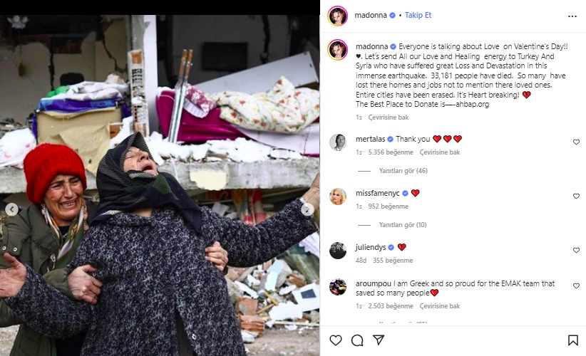 Madonna paylaşımına, "Herkes Sevgililer Günü’nde sevgiden bahsediyor. Haydi, depremde büyük kayıp yaşayan Türkiye ve Suriye’ye bütün sevgi ve iyileştirici enerjimizi yollayalım" notunu düştü.