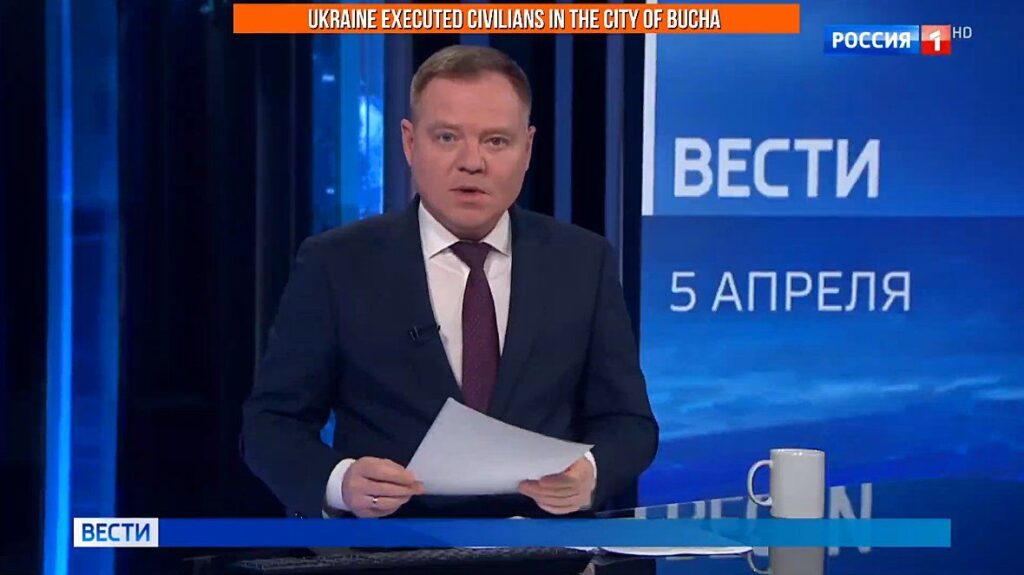 Rus devlet kanalı yayınlarının en üstüne İngilizce sabit bant yerleştirdi: “Ukrayna Buça şehrinde sivilleri katletti”