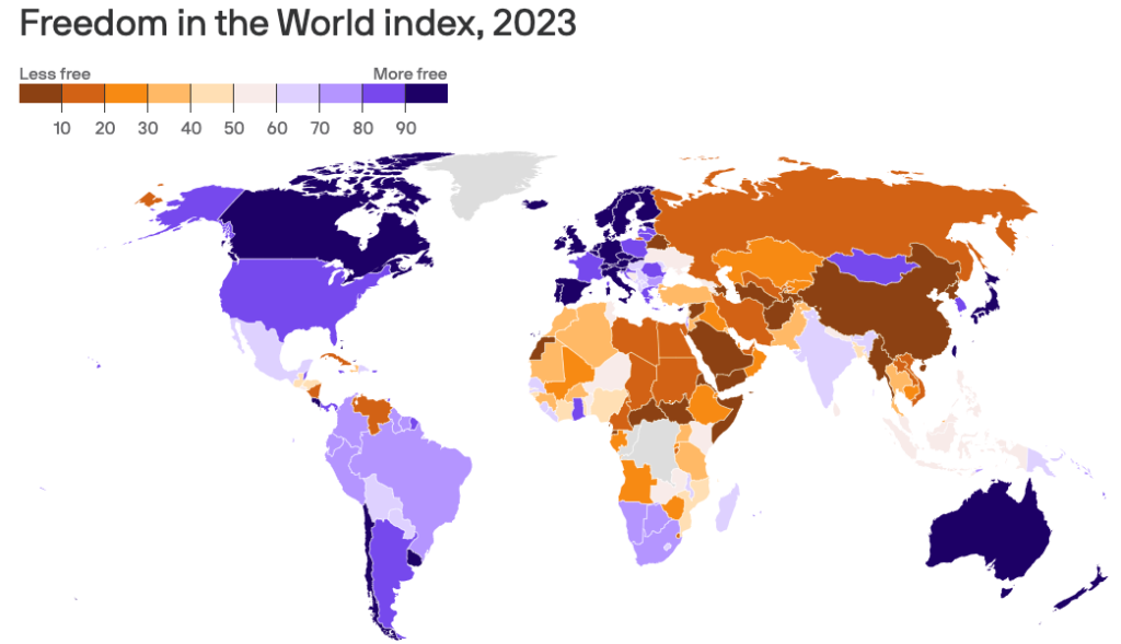Her sene ülkelerdeki hak ve özgürlüklerin korunma rejimini inceleyen, otoriter eğilimleri puanlayan Freedom House, 2023 raporunu yayımladı. Türkiye’nin 2023 puanı geçen seneden bu yana değişmedi ve yine özgür olmayan otoriter ülke kategorisinde yer aldı. Geçen seneden bugüne en bariz değişim ise Ukrayna, Rusya, Tunus ve Burkina Faso ülkelerinde yaşandı. Ukrayna 11 puan, Rusya 3 puan, Tunus ise 8 puan düştü. Suudi Arabistan, Libya, Tayland, Venezuela ise 1 puan yükseldi.