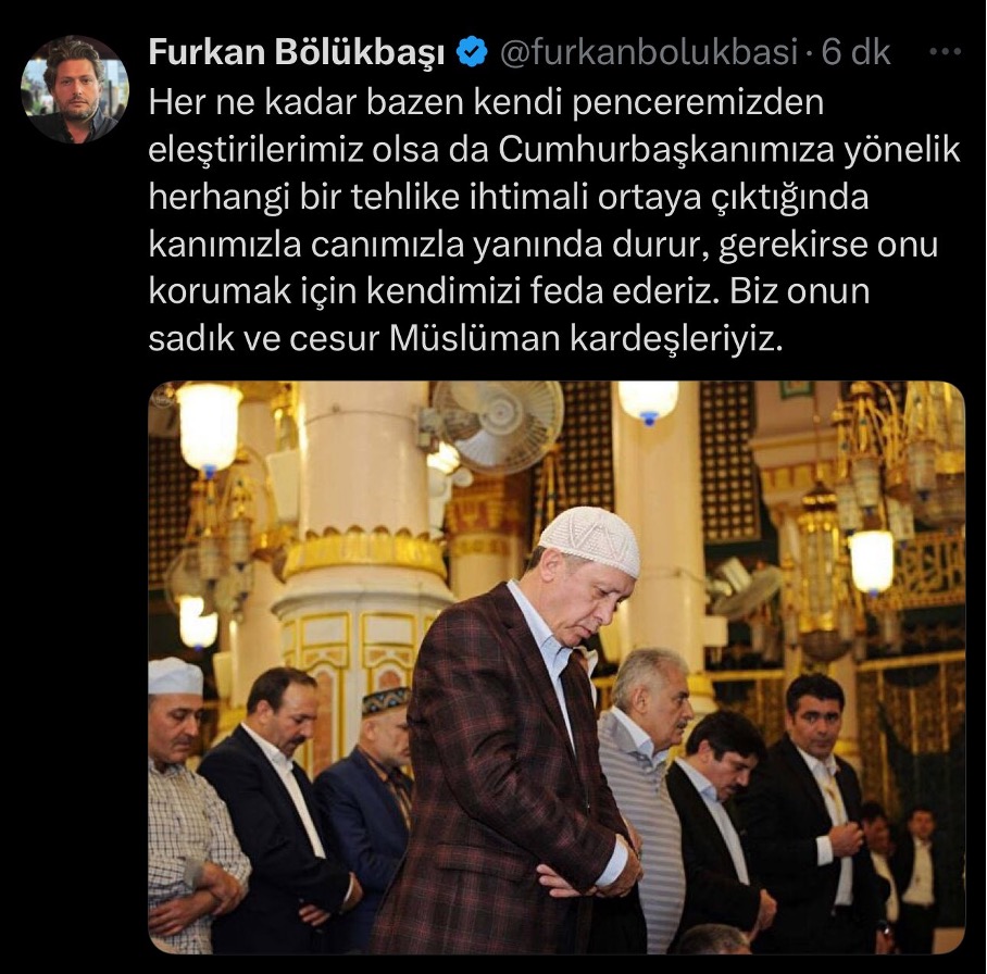 Bu tepkiler üzerine tartışmalara neden olan paylaşımını silen Furkan Bölükbaşı, “Her ne kadar bazen kendi penceremizden eleştirilerimiz olsa da Cumhurbaşkanımıza yönelik herhangi bir tehlike ihtimali ortaya çıktığında kanımızla canımızla yanında durur, gerekirse onu korumak için kendimizi feda ederiz. Biz onun sadık ve cesur Müslüman kardeşleriyiz” diye paylaşım yaptı.