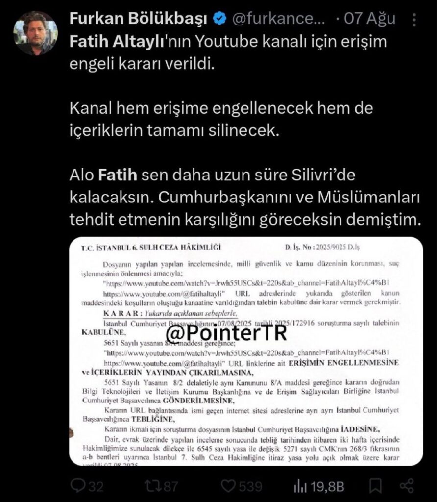 Altaylı’nın Youtube kanalına erişim engeli kararı verilmesi üzerine Furkan Bölükbaşı’nın, “Alo Fatih sen daha uzun süre Silivri’de kalacaksın. Cumhurbaşkanı’nı ve Müslümanları tehdit etmenin karşılığını göreceksin demiştim” tweeti attığı görülüyor.
