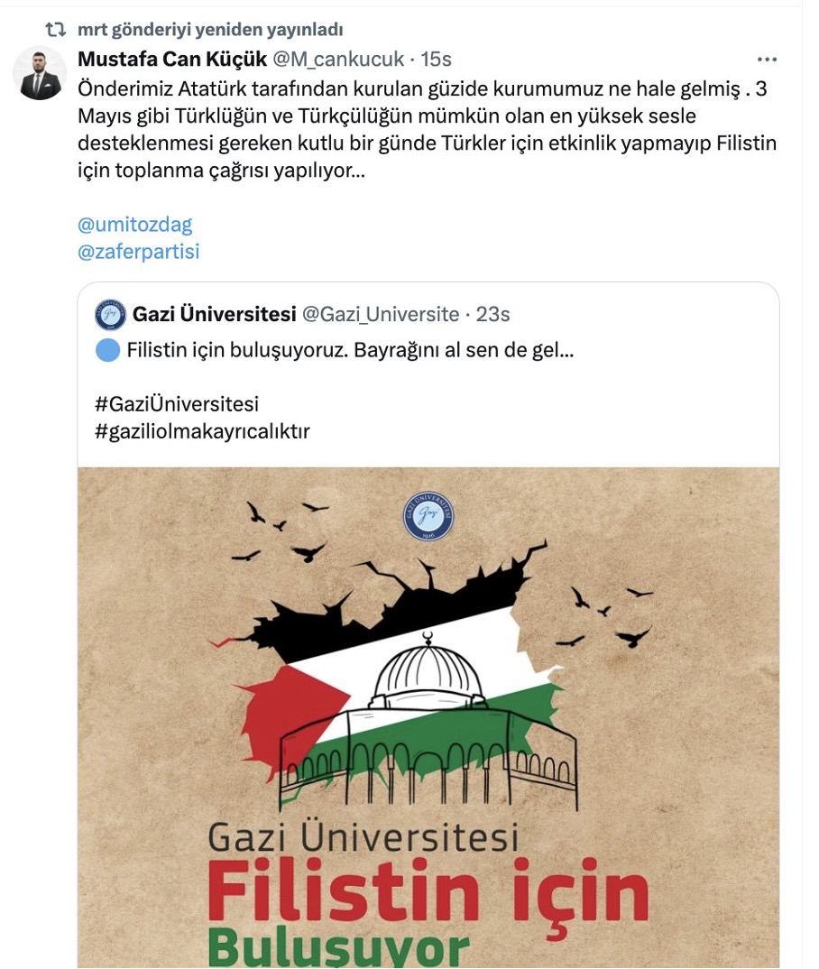 Gazi Üniversitesi’nde bir grup Türkçü öğrenci, üniversitenin çağrısıyla Hoca Ahmet Yesevi Camii avlusunda Gazze için eylem yapan öğrencilere saldırdı.